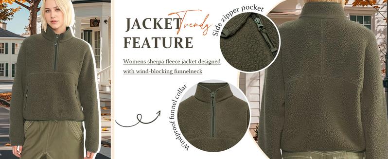 - Feature: Womens sherpa fleece jacket designed with wind-blocking funnelneck, relaxed drop shoulders, side zipper pockets.It's the perfect throw-on-and-go layer that'll keep you warm and comfy